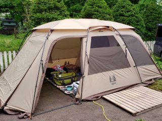 先の『北軽井沢スウィートグラス』にて[テンマク/焚火タープTCレクタ]を同伴家族と我家で計7名の共有スペースとて使用、且つ2テントと濡れない導線を確保しようとしたが敢え無く失敗。TO家のテントと[オガワ/ファシル]短辺側 …