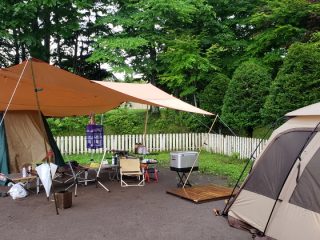 『北軽井沢スウィートグラス』キャンプ2日目。朝5時の気温は約15℃と肌寒いが雨は降っていない。 (function(b,c,f,g,a,d,e){b.MoshimoAffiliateObject=a …