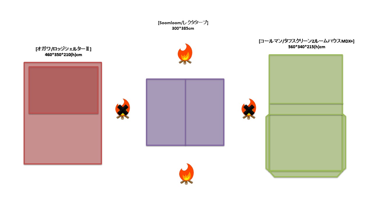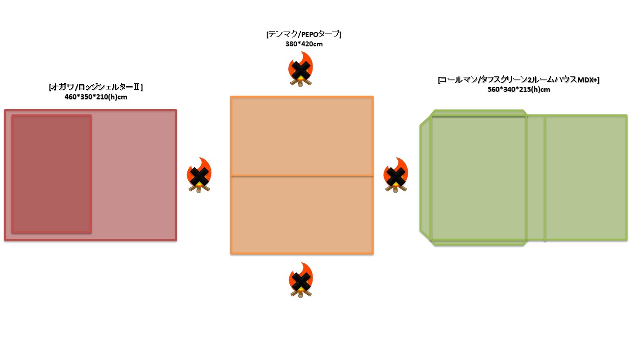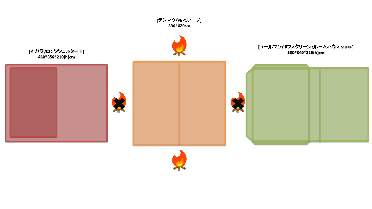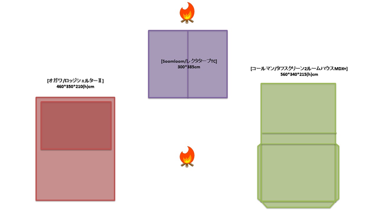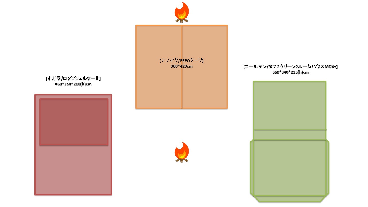 夏キャンを通じて思うことがある…やはりオープンタープは風が抜けて涼しい!2家族でキャンプをする際は2テント用のサイトを使用することも多い。夏場は2つのテントと共有リビングスペースとしてタープを一張すると使い勝手が良い。今回は2テントサイトにおける2ルームテント2幕とオープンタープ1幕のレイアウトについてタープ周りへの火元(焚火台)置場を多々私見交えて考えてみる。実際のサイトは長方形でないことも多く、木や岩があったりしてイメージ通りに配置することは出来ないことも多いのだけれど。