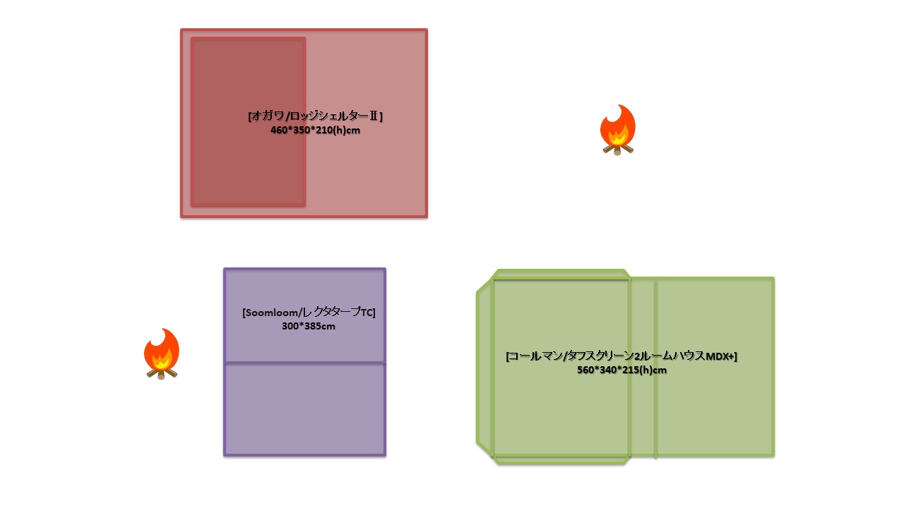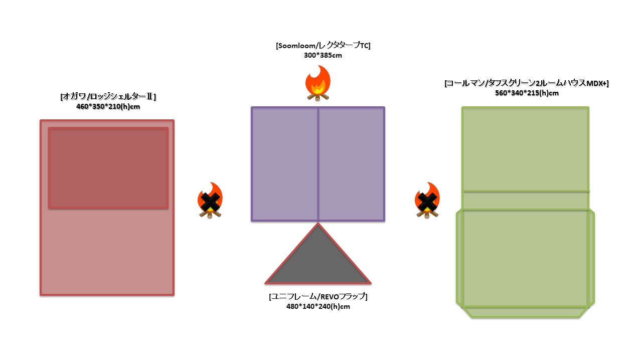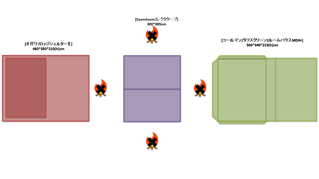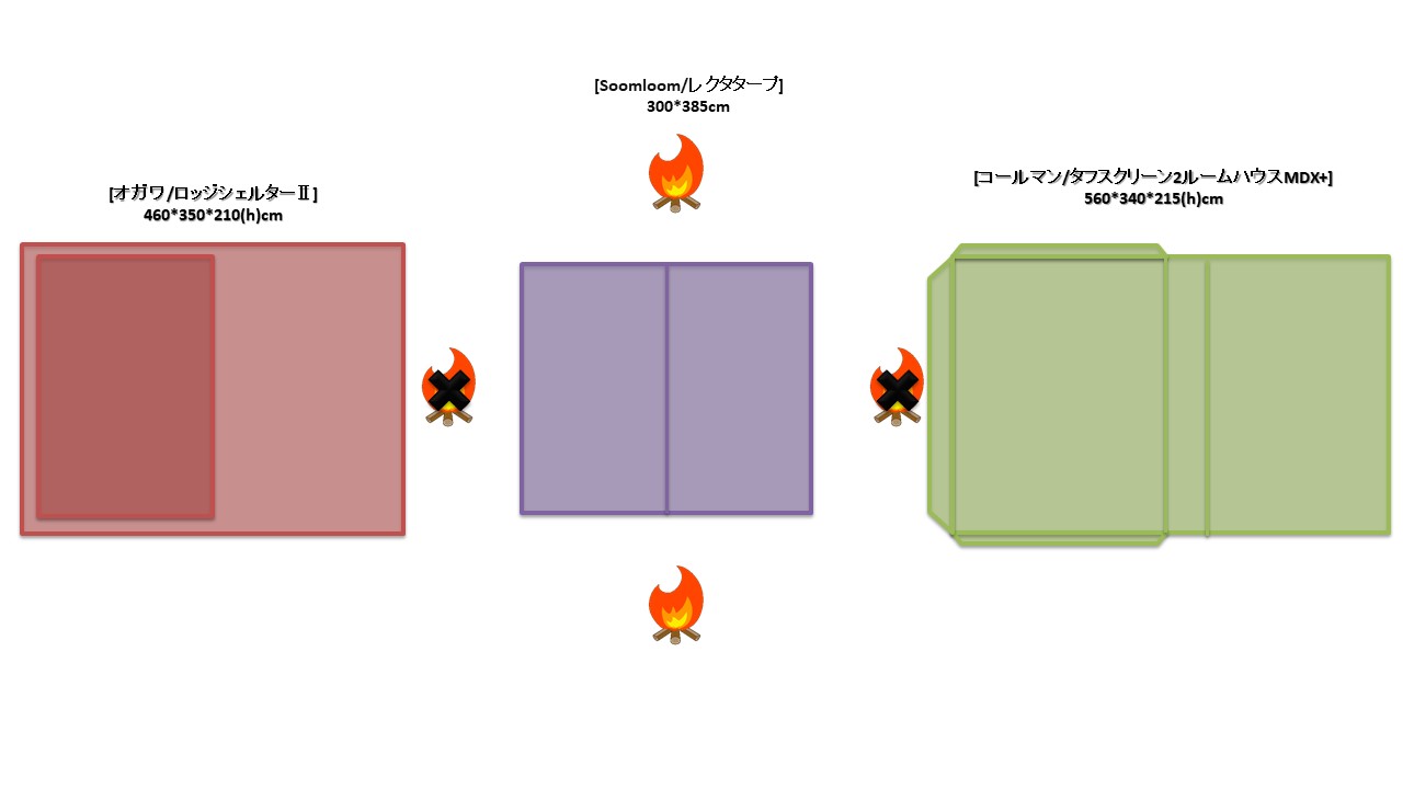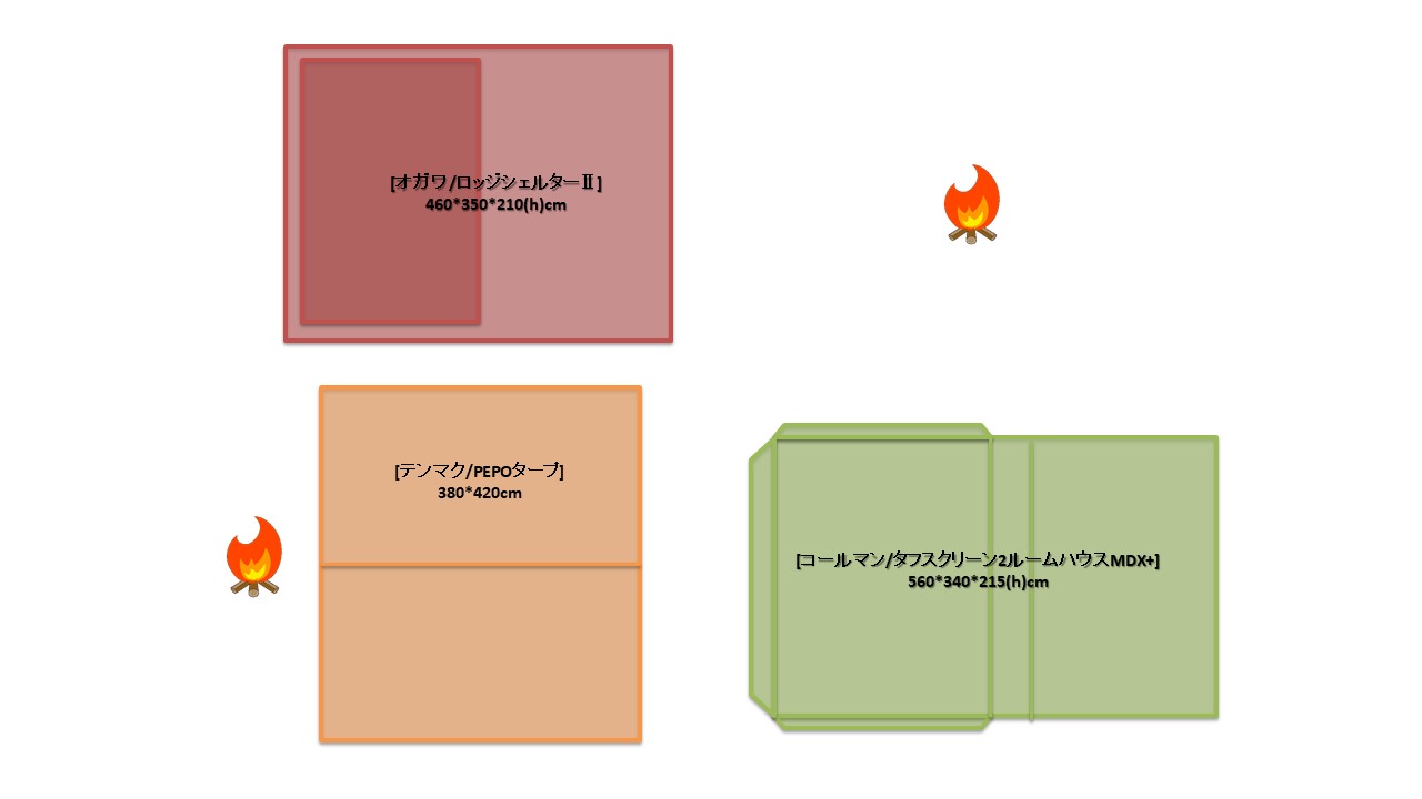 夏キャンを通じて思うことがある…やはりオープンタープは風が抜けて涼しい!2家族でキャンプをする際は2テント用のサイトを使用することも多い。夏場は2つのテントと共有リビングスペースとしてタープを一張すると使い勝手が良い。今回は2テントサイトにおける2ルームテント2幕とオープンタープ1幕のレイアウトについてタープ周りへの火元(焚火台)置場を多々私見交えて考えてみる。実際のサイトは長方形でないことも多く、木や岩があったりしてイメージ通りに配置することは出来ないことも多いのだけれど。