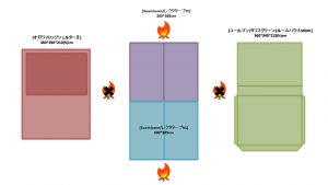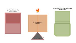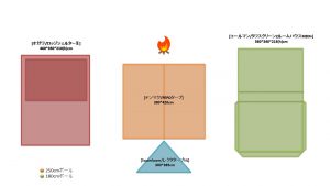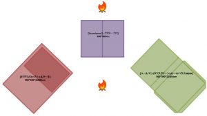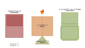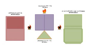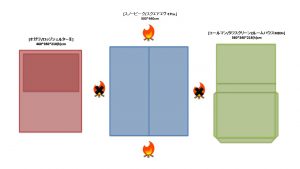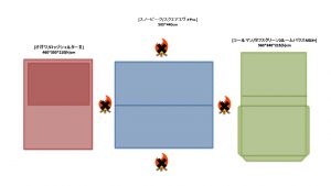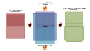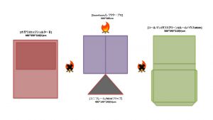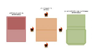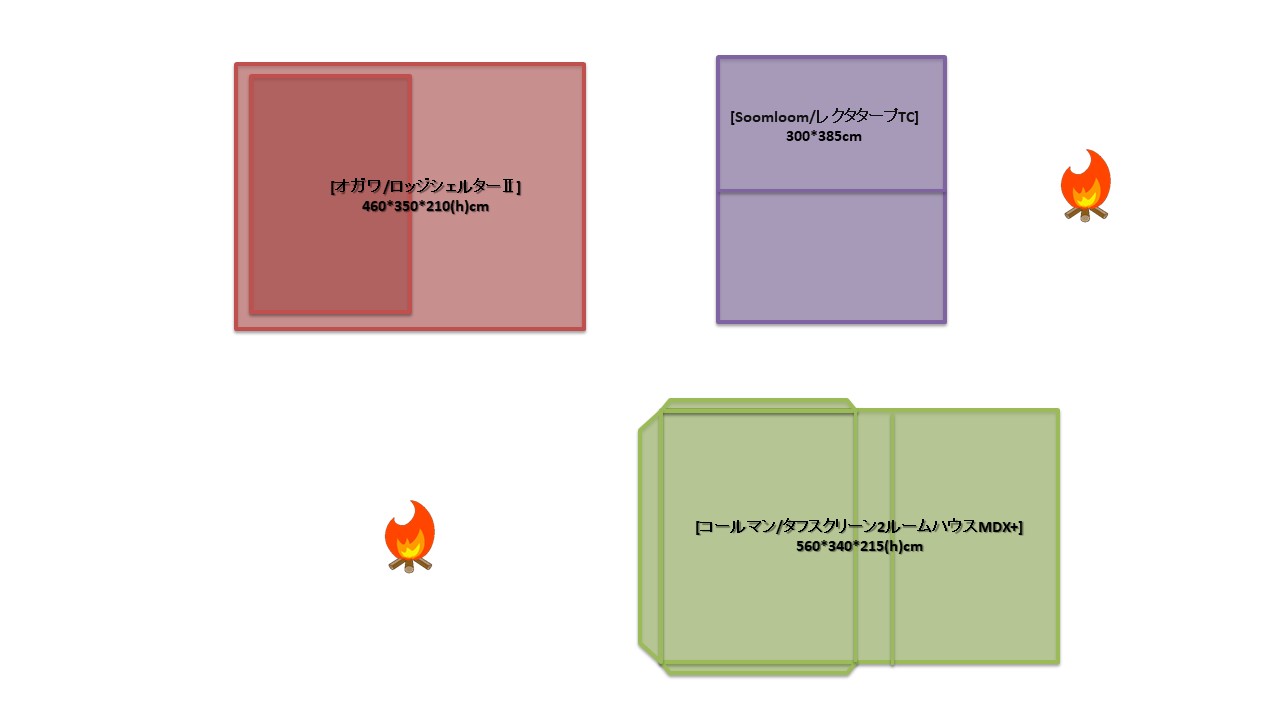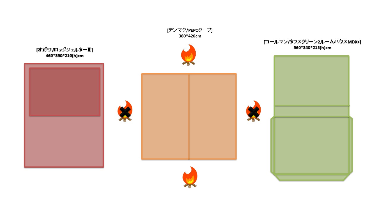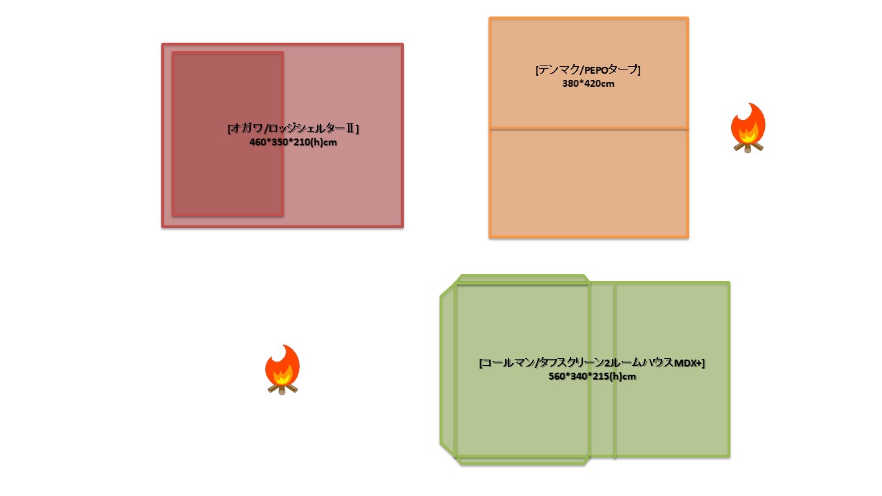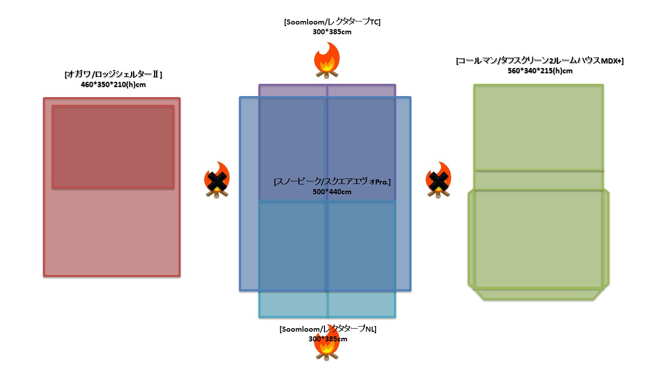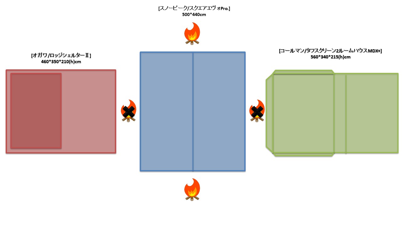 夏キャンを通じて思うことがある…やはりオープンタープは風が抜けて涼しい!2家族でキャンプをする際は2テント用のサイトを使用することも多い。夏場は2つのテントと共有リビングスペースとしてタープを一張すると使い勝手が良い。今回は2テントサイトにおける2ルームテント2幕とオープンタープ1幕のレイアウトについてタープ周りへの火元(焚火台)置場を多々私見交えて考えてみる。実際のサイトは長方形でないことも多く、木や岩があったりしてイメージ通りに配置することは出来ないことも多いのだけれど。