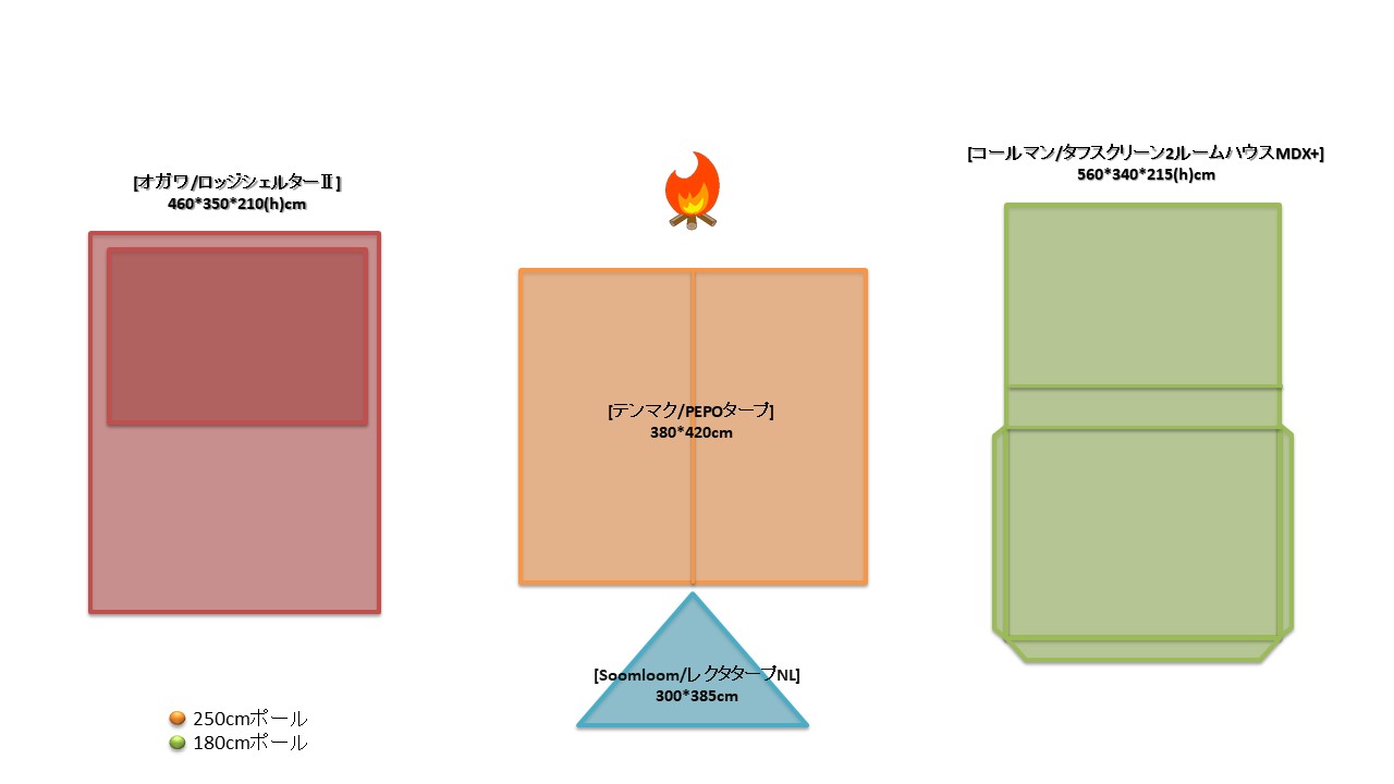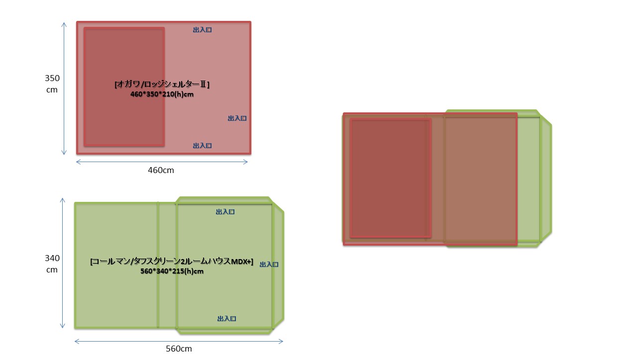 今回イメージするテントは我家の愛幕[オガワ/ロッジシェルターⅡ]と、KWさんの新幕[コールマン/タフスクリーン2ルームハウスMDX+]。全幅はロッジシェルターⅡに比べタフスクリーン2ルームハウスMDX+の方が+100cmと長く、奥行きは-10cmと短い。尚、[オガワ/ロッジシェルターⅡ]はインナーテント使用の2ルームテントとする。2ルームテントは前室が広くメッシュ仕様やキャノピー開放も出来て1家族の場合はタープレスで過ごすことも出来るのが利点だが、流石に真夏の炎天下時には前室は暑くて過ごし難い。なので2テントサイトの場合、別途共有リビングスペースとしてオープンタープを設置すると風の抜けが良く快適度がUPする。