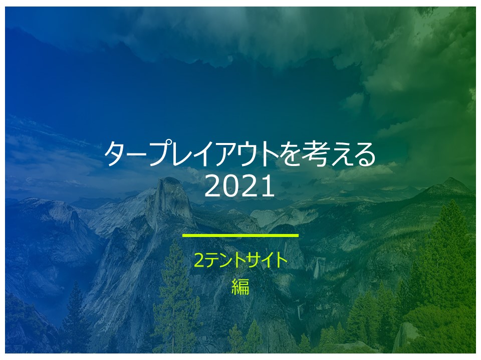 2家族共有スペースとなると一番使い勝手の良いタープは稜線長380cm/ルーフ長420cmの[テンマクデザイン/PEPOタープ]。汎用性が一番高いのは2つのテントをタープ稜線を平行に並べる並列型のレイアウトだと思われる。このレイアウトを軸に2テントサイトの広さ、木や岩等を踏まえて実際のレイアウトを考えていくのが良いかな。2つのテントをタープ稜線を直列に並べる直列型は導線が良いが全幅方向に少なくとも18.5mは必要となり通常の2テント区画サイトにはレイアウトし難い。