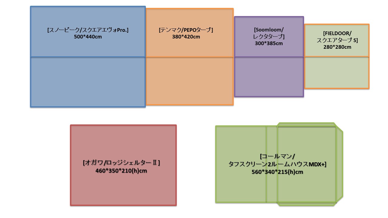 2家族共有を考えると使用するタープは[スノーピーク/スクエアエヴォPro.]、[テンマクデザイン/PEPOタープ]、[Soomloom/レクタタープ]の3種。2家族なら[テンマクデザイン/PEPOタープ]のサイズ感が一番よさ気。[フィールドア/スクエアタープS]は2家族使用には小さすぎるためサブタープとしての位置付け。