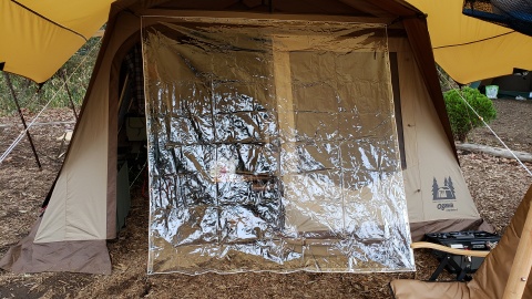 前室側の長辺側半面メッシュパネルのクリアウォール化は実用的。幕内から幕外の視界を保ちつつ暖房能も維持できる。裾部余りが気になるようなら少しカットして調節しても良い。