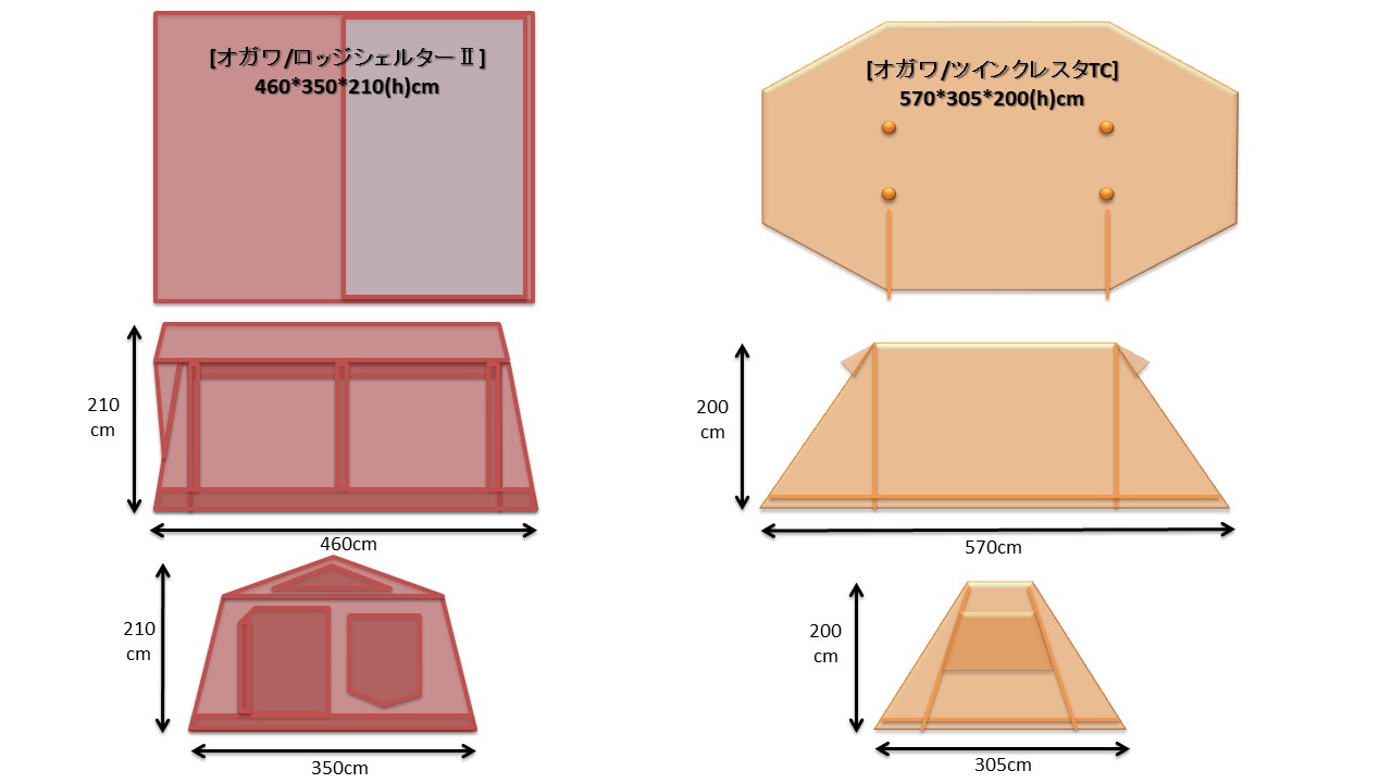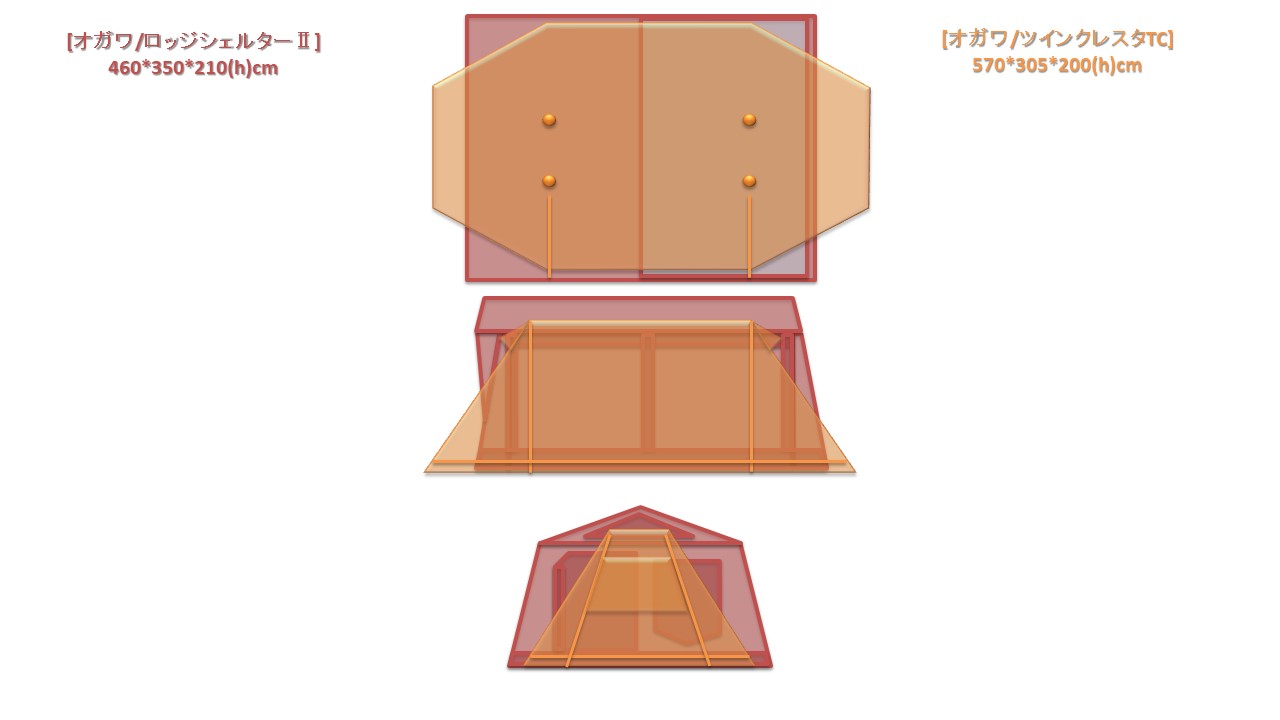 ボトム面積はそれ程の違いはないが、ロッジシェルターⅡは幕壁の角度が垂直に近いので幕内空間はツインクレスタTCに比べ一回り大きい。