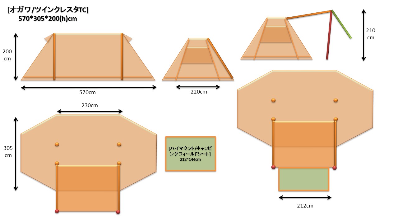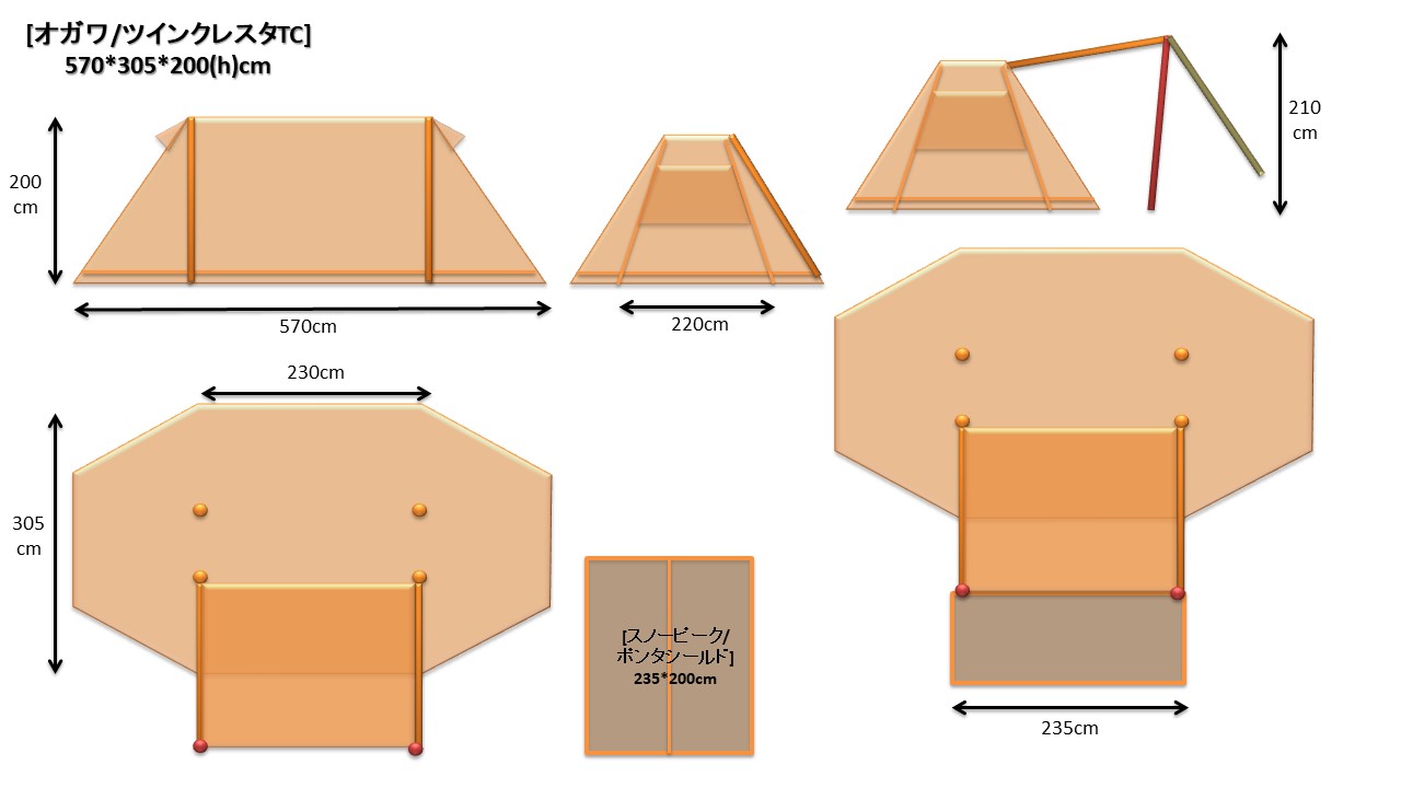ハーフインナーと二又ポール仕様も含めた[オガワ/ツインクレスタTC]のトレースイメージ。