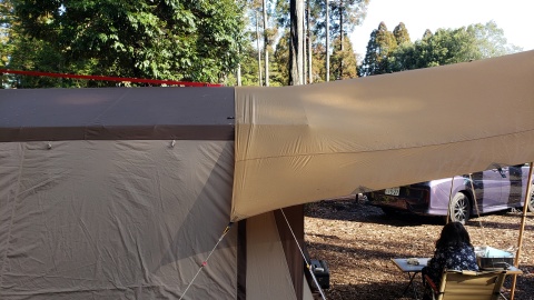 設営スペースを極力抑えつつ、オガワ張りすることでロッジシェルターⅡの短辺側入口の庇を延長することができる。連結部にタープポールがないためシェルターテント⇔タープ間の動線がスムーズ。タープ下のスペースは狭いため、ロッジシェルターⅡ前面パネルを半面ではなく全開放したほうが使い勝手が良くなる。また、ポリコットン生地のため炎天下時でも良質な影を演出してくれる。タープ下有効スペースは狭いが設置スペースもミニマムで区画サイトでもセッティングできる可能性が高いためロッジシェルターⅡと併せるタープとしては最も汎用性が高い