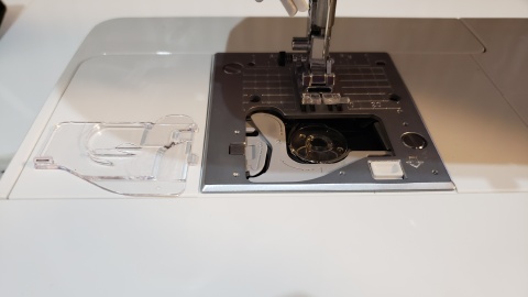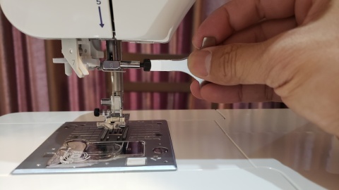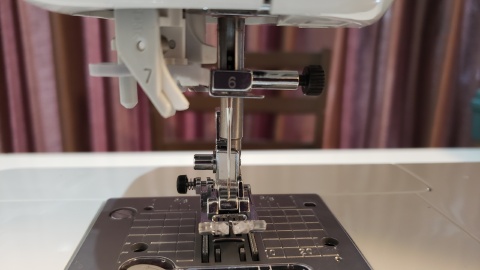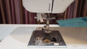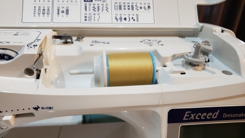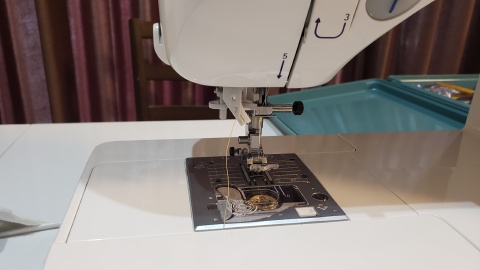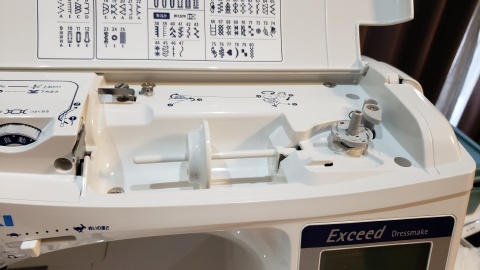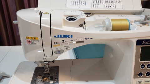 上糸の準備。これがまた難しい。何度もDVDを繰り返し再生しながらチャレンジするも自動糸通しがどううにもこうにも上手くいかない(>_<)。よくよくみてみたら抑えを下ろしていなかったのが判明…糸が通ってからの糸を出すのも何気に難しい(´;ω;`)ウゥゥ。