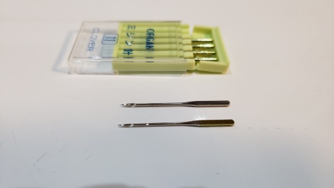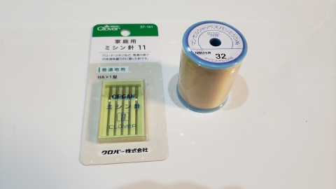 取扱説明書とDVD動画を見ながら捨て生地を使って練習開始。今回はフットコントローラーとワイドテーブルは使用せず。糸は普通地用ミシン糸#60、針はデフォルトで取付のサイズが分からなかったため、別途購入した11番の針に交換。