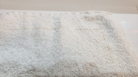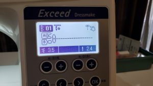 押え圧調節ダイアルは5の位置に合わせる。模様No.⇒ダイレクト1、押え⇒基本押えA(デフォルトでセット)。古いタオル生地を使って直線ぬいの練習。