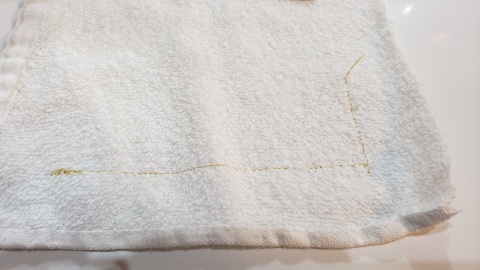 ぬい方向を変えての直線ぬい⇒ぬい終わりの返しぬい⇒自動止めぬい糸切り。左が表面、右が裏面。裏面の方が糸がはっきり見えているため糸調子を調整する必要があるのかもしれない。