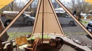 やはり、インナーテントは[オガワ/ロッジシェルターTCインナー5人用]が便利。何といってもインナーテント内で直立可能なこと、コットやマットの展開撤収作業が楽なことが良い。また、中央部に電気カーペットを配置することで床暖房仕様にありポカポカになるのが嬉しい。コットはハイコット仕様でコット下を荷物置場として使用、インフレーターマットは2枚並べてその上にセミダブル用のシーツを掛けて使用。