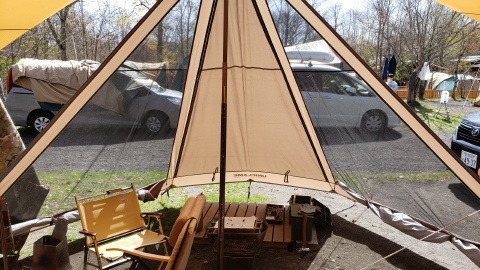 雨天設営となったため、水を吸って重くなるポリコットン生地ではなく軽量で取り回しの良いナイロン生地タープに変更。ナイロン生地は遮光性が低いが元々の気温が低かったためむしろ炎天下でもタープ下が程よく暖かくて良かった♪[Soomloom/レクタタープNL300*385cm]は両翼が385cmと長いため両翼が長いため雨天時の雨除けスペースが広くて良かった。一方、両翼が広いことで2テントサイトだと設営スペースが広く必要となるため[Soomloom/レクタタープTC250*295cm]の方がレイアウトの上では使い易かったかもしれない。