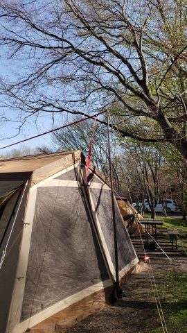 ロッジシェルターⅡにオガワ張りで連結することにより雨に濡れない動線を確保することが出来き雨天キャンプの快適度が増す!雨天設営時はタープを先行して設営しタープ下でテント設営の作業を実施するのが理想だが今回はスキル不足のためテントを先行する形になった。次回同じような状況になった場合はタープを先行して設営したい。前回に引き続きの問題点となったのがセッティングテープとテント稜線部との強風時の干渉音。メインタープポール後方の長さを220cmと低めにするか、270cmと高めにセッティングすることにより解消されるが、安定性を考えると低め設定が良いかもしれない。セッティングテープに付属していたカラビナ紛失(>_<)。