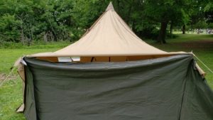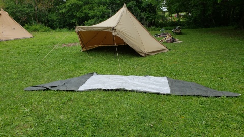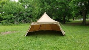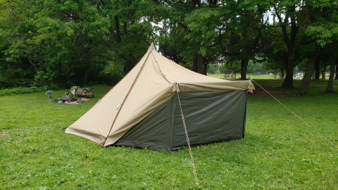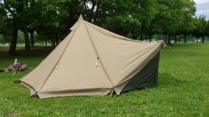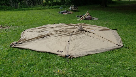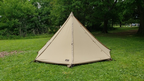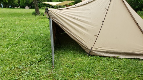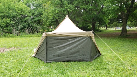 タッソTCをヘプタスタイル(七角形)で設営。タッソTCのポールセットを自宅に忘れて来てしまったため[テンマクデザイン/デュラスティック130-280]で220cm長に調整しポールキャップを付けて225cmポール長の支柱ポールとして代用。