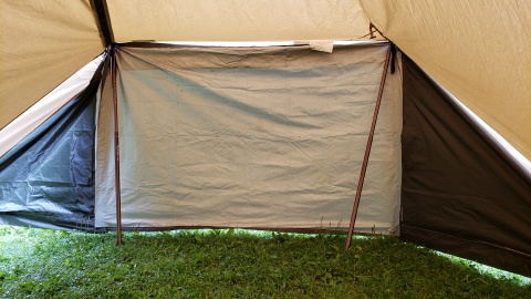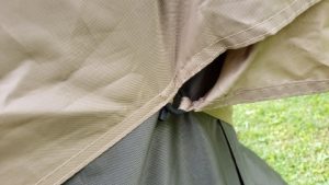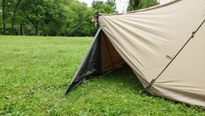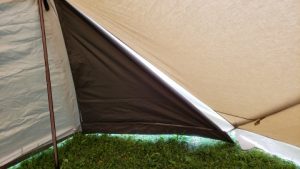 サイドウォールをフロントウォールと同じ位置にペグダウンし出入口とした。