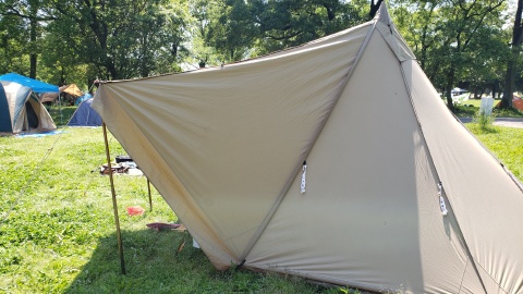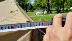 [オガワ/タッソTC]のヘキサスタイル(六角形)の拡張用パネル2枚を開放し、バップテント調にキャノピーを立ち上げて際のポールの最適長を検証。これまでの試張り検証の結果を踏まえると予想は160cmが最適長なはず。