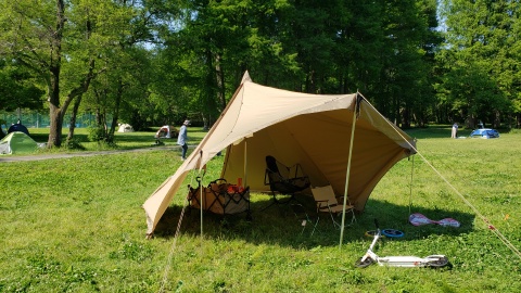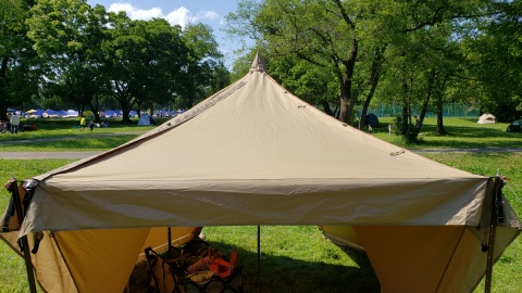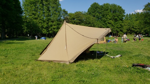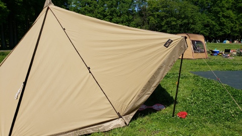 嫁が夏のファミキャンでも転用できるのではと言い出したため、タッソTCのアレンジ中で最大空間を誇る190cmポール*1本+130cmポール*2本による前面パッカーンスタイルにしてみた。前面が大きく開放しているため、160cmポール*2本よりも幕内の風の抜け及び視界も良好♪これにメッシュスクリーンを装着し、純正インナーテントにインフレーターマット2枚、前室にメッシュテントを配置すれば3人ファミキャンでも転用できるかもしれない。
