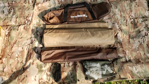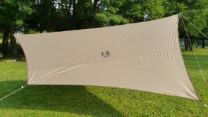 タープ本体の重さは2.4kgと大型サイズの割には軽いかな。左右対称上下非対象の形状のため左右上下対象のヘキサタープに比べるとタープ単体のアレンジは少ないが、付属の4mのセッティングテープを使ってオガワ張り連結ができるのが特徴。