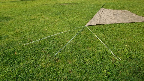 ラチェットポールと張り網も設営位置の地面に配置し凡そ60℃の角度でペグダウン。