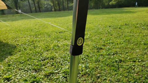 セッティングテープを4m⇒2mに短くして設営。余ったセッティングテープはマジックテープでポールに停めることが出来るため風が吹いてもブラブラしない。