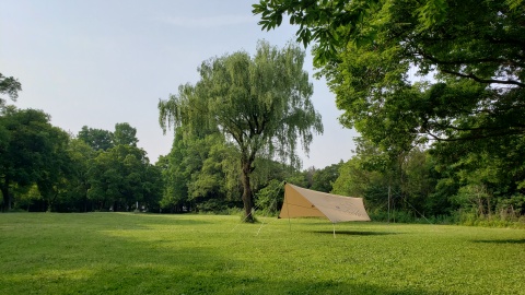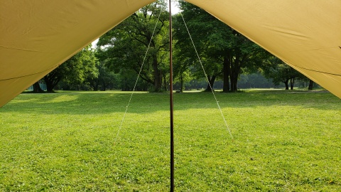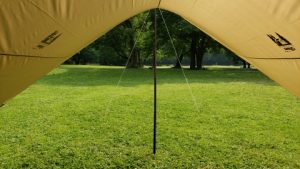 タープ下の解放感はピカイチで風の抜けも良く、タープ下から視界も良好。難点は日陰スペースが若干狭いことと、雨天時の雨撥ねリスクが高いこと。