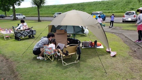 今回の拠点はコチラ。今回も日除けは勿論、にわか雨が降った際の雨除けにとパラソルタープ大活躍!マイナーな商品みたいだが我家にとっては海にテニスにキャンプにと常備車載の必須アイテム!