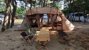 雨に濡れない動線は確保できないがツーマンソロやスリーマンソロ時時の炎天時に共有リビングスペースとして出動したら重宝しそう。