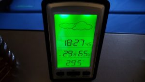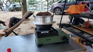 白米炊飯。18時半頃の気温は約30℃。風が強いが、生暖かい。