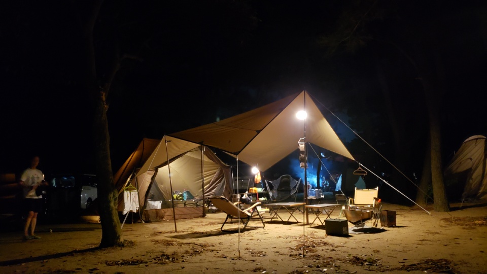 21時過ぎにやっとスマホ現在地気温が30℃を下回る…が湿度も高く蒸し暑い(>_<)。熱帯夜対策としてタッソTCはメッシュスクリーンを全面メッシュ仕様、背面パネル開放、吊り下げ型インナーテントフルメッシュ仕様且つ、ポータブル扇風機を配置しシェラフレスにて就寝。