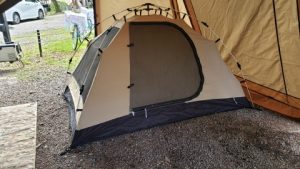 今回併せるのはいつものオープンタープではなく3ポールフレームのドームシェード[ケルティ/サンシェード]。サンシェードの辺をロッジシェルターⅡの短辺側入口に併せてみたが、サンシェードの高さがないため導線が悪い!設営の様子は別記事にて投稿予定。