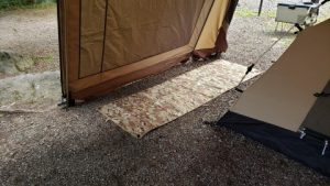 そして、[オレゴニアンキャンパー/グランドシートLハーフサイズ]の上に[ヘリノックス/コットワンコンバーチブルハイコット仕様]を置いて、[フィールドア/ポップアップメッシュテント]を装着。インナーテントとコットの間に土間通路が出来きロッジシェルターⅡの後面を開放すれば導線が確保出来て使い易い♪