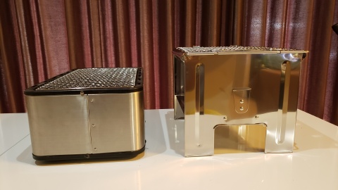 外観比較。[ホンマ製作所/サンフィールドステンレス 炭焼きグルメ M-450S]は長方形、[尾上製作所/フォールディングBBQコンロII]は正方形に近い。