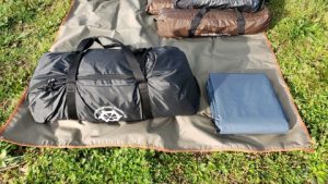 [DOD/カンガルーテントS]とハイコット装着[フィールドア/ポップアップメッシュテント]のカンガルースタイルで臨む。[キャプテンスタッグ/オクタグランドシートUA-4529]は半分もしくは3分の1に折った状態で使用し半土間にする予定。