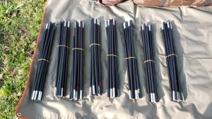 前回は以下の順番で設営したが(先端が)黒色ポールを立ち上げてから赤色ポールをスリーブに通すのが大変だっため今回は黒色と赤色ポールの4本をスリーブに通してから、黒色ポールをハトメに刺す順番で試してみる。