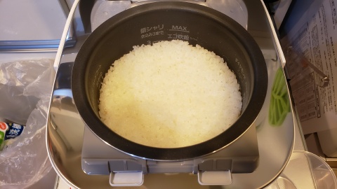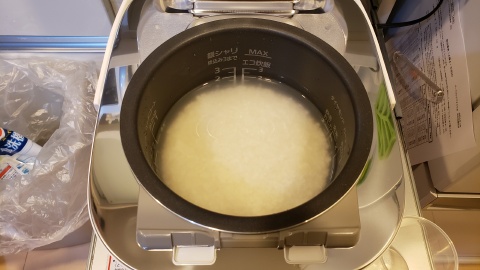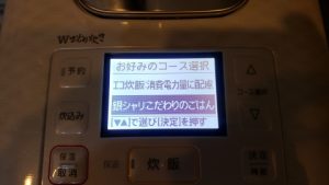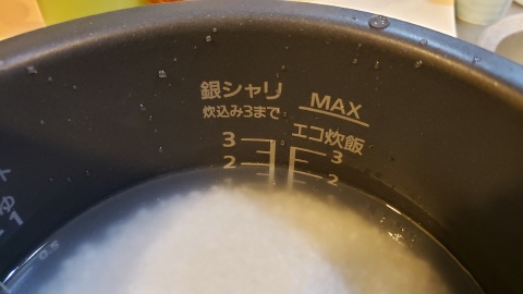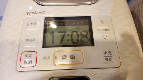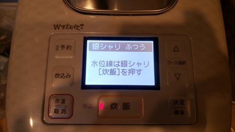 今回はコシヒカリ2合を“銀シャリ ふつう”モードで炊飯。デフォルトで給水時間も含まれているモードになっているため米を研いだ後直ぐに“炊飯ボタン”を押して炊飯開始!