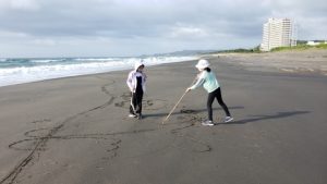 子供らは砂浜をキャンバスにお絵描きタイム♪