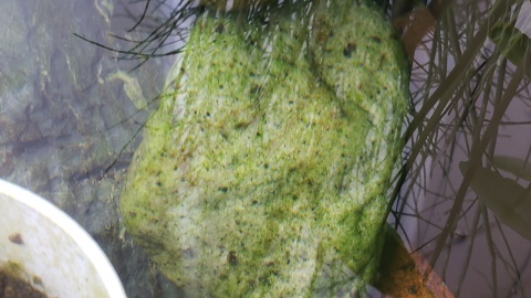 練り床水槽(500L)は気温と水温の上昇により水草がかなり茂ってきた。