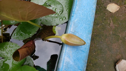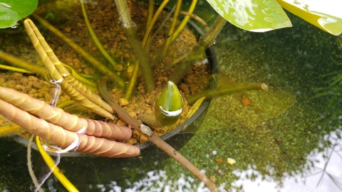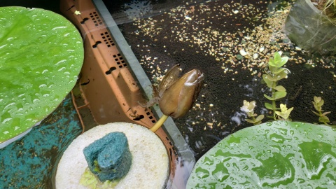 耐寒性睡蓮“ローズ・マグノリア”は父親により開花を確認。左は開花の終わった蕾、右は新たな蕾。