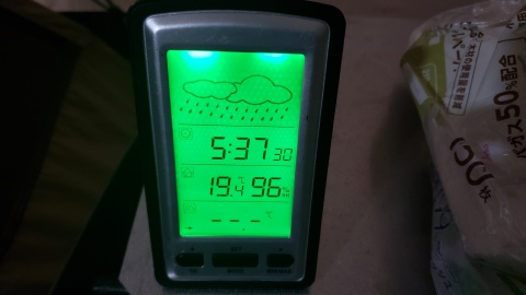 朝5時頃のスマホ現在地気温は18℃、室内外温度計の気温は19℃。室内外温度計の子機温度がどうにもこうにも表示されない(>_<)。多分故障(´;ω;`)ウゥゥ。