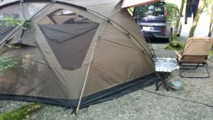 今回3回目の出動となる[WIWO/ヤクドーム460]。フレームワークからペグダウン(張り網なし)迄約30分で設営。