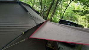 サイトはそれなりに広いのだが、樹々や石があり[DDハンモック/DDタープ 350*350]を張るのは難しいため小型の[スノーピーク/ポンタシールド235*200]をサブポール200cm*2を使って直結連結することに。