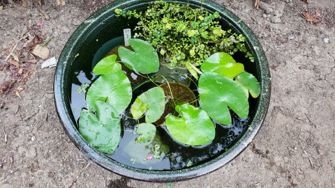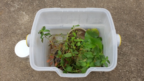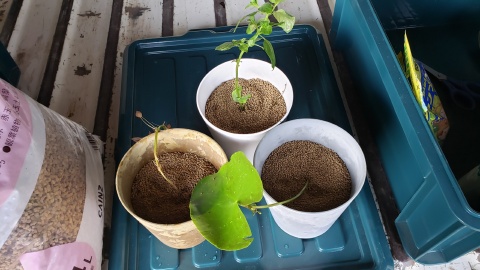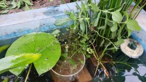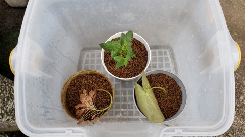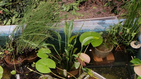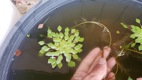“ウォーターミント”、“ウォーターダイヤ”、“ガガブタ”を実家で枝分けするために一旦鉢毎取り出す。