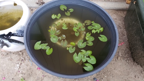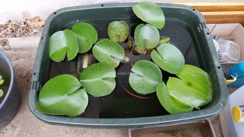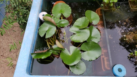 最大容量の[ダイライト/角型容器RL-500L]水槽。睡蓮の葉は時折、父親がトリミングしてくれていることもありそれ程繁っていない。