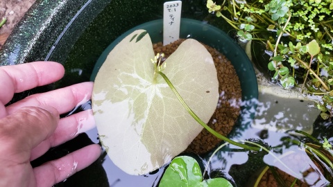 “ヒメコウホネ”は一部の葉が黄色く変色しており元気がなく花の咲く気配もない。