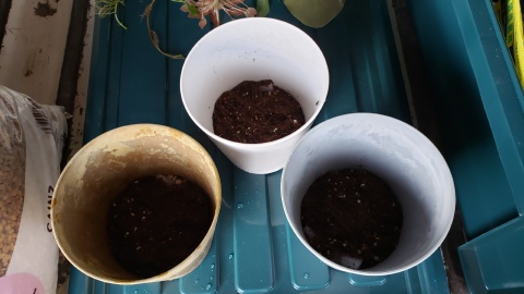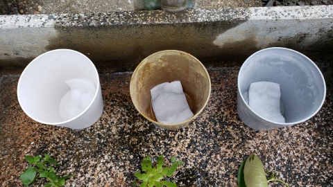3つの内鉢を自宅ベランダの外鉢の発泡スチロール鉢に沈める。