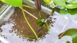 ガガブタは葉の幹直下から根を張るはずだが、根ではなく蕾が出ているのでとりあえず茎を植えてみた。