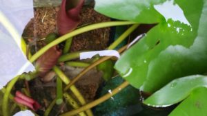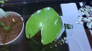 先行して開花した耐寒性睡蓮“ローズ・マグノリア”は葉だけが茂っている。