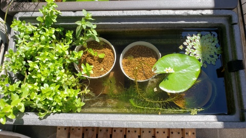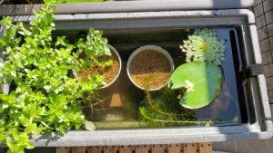 ベランダビオトープは現在プラ鉢(78L)と発泡スチロール鉢(25L)の2鉢体制。